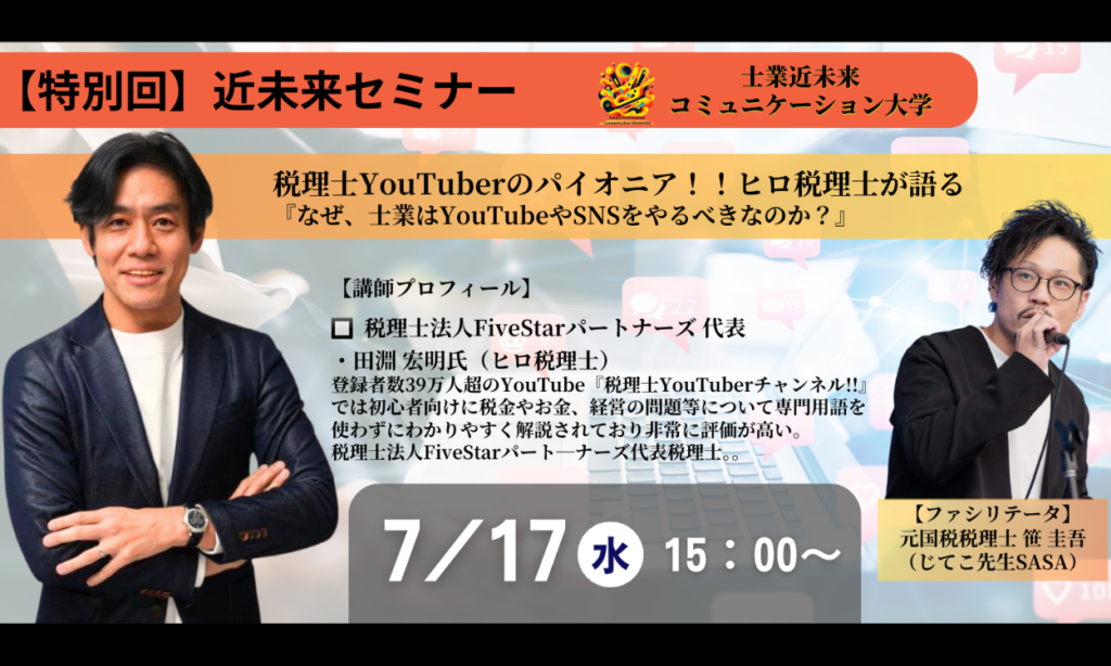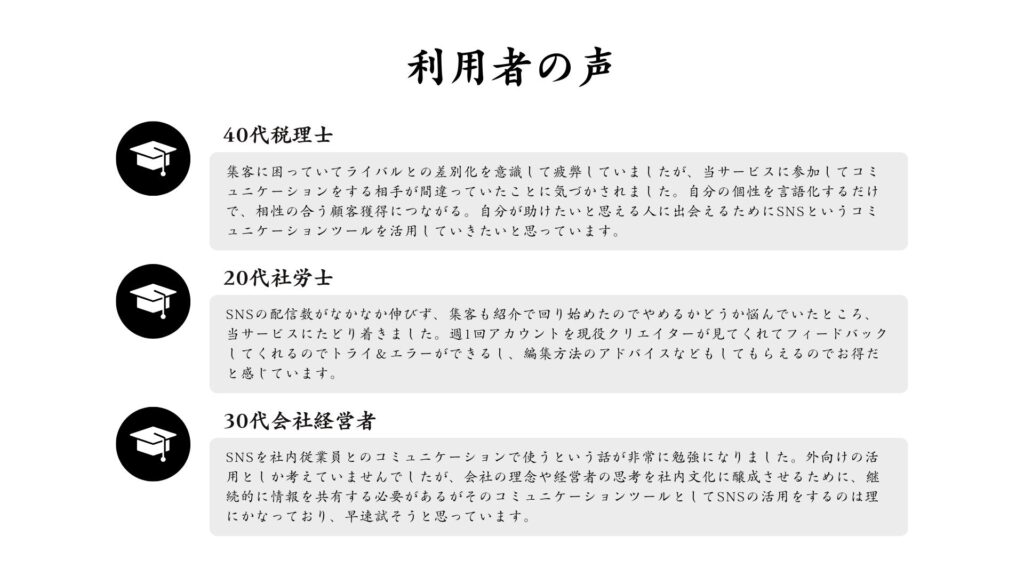そして、多くの方に情報発信する過程で一方的な情報発信ではなく、双方向のコミュニケーションの重要性に気づきました。 SNSはフォロワー数や再生数を獲得することが本質ではなく、スマホの向こうにいる方とのコミュニケーションにこそ価値があります。 士業業界でSNSの利用率は非常に低いものとなっています。そして、クライアントや従業員とのミスコミュニケーションにより多くの 機会損失を被っている現状があります。 自分を知ってもらい、相手を知る。オンラインとオフラインのそれぞれの良さを融合した新時代のコミュニケーションスキルとして、 ミスマッチの無い交流関係が構築できるツールとして、SNSなどは非常に有効なものとしてご提案させていただきます。
